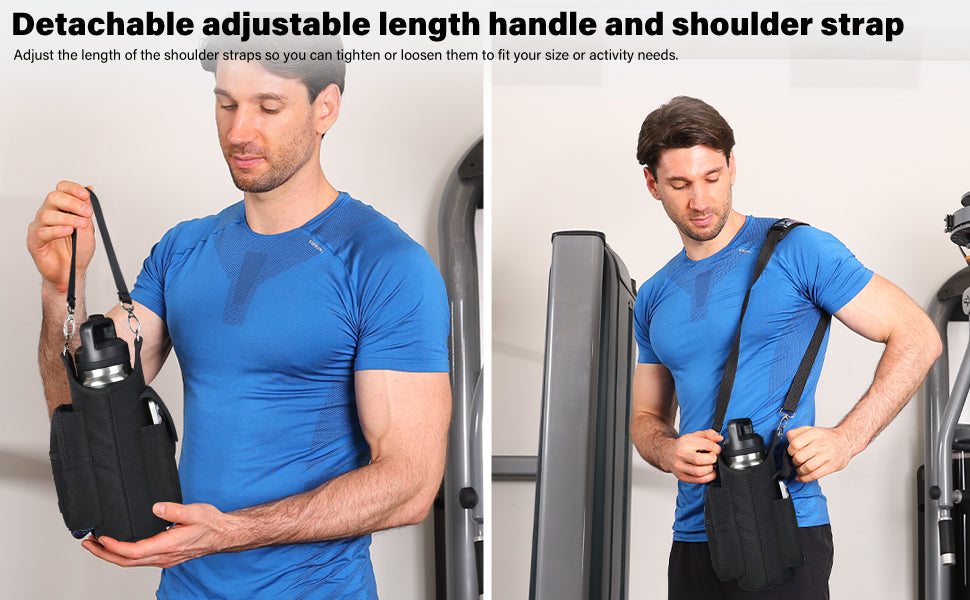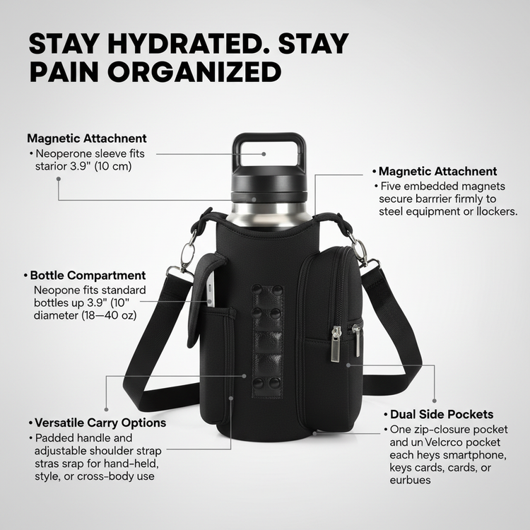 • Five built-in magnets attach anywhere metal • Fits bottles up to 100 mm diameter • Two zippered side pockets for phone and keys • Stretchy, water-resistant neoprene with padded handle and strap
